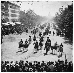 (above) PENNSYLVANIA AVENUE, WASHINGTON, D.C. May 23 AND MAY 24, 1865: GRAND REVIEW OF THE UNION ARMIES. THE CAPITOL BUILDING LOOMS IN THE DISTANCE, ITS MYSTERIOUS, NEWLY-MOUNTED “STATUE OF FREEDOM” OBSERVING THE PARADE FROM THE LOFTY ZENITH OF THE SPARKLING CAST-IRON DOME.